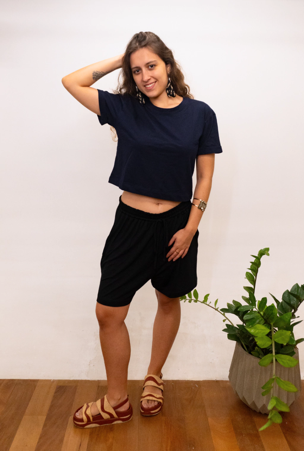 • Modelagem solta e cropped: valoriza a cintura com leveza.