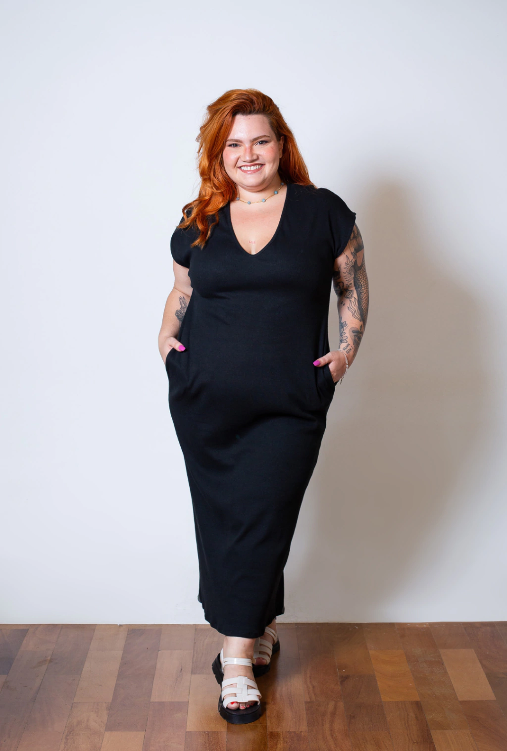 O Vestido Renata traz sofisticação e praticidade para o seu dia a dia. Confeccionado em malha ribana com elastano, ele proporciona um caimento leve e confortável, valorizando a silhueta com um toque elegante. O decote V alonga o colo, enquanto os bolsos laterais trazem funcionalidade para a rotina sem abrir mão do estilo.